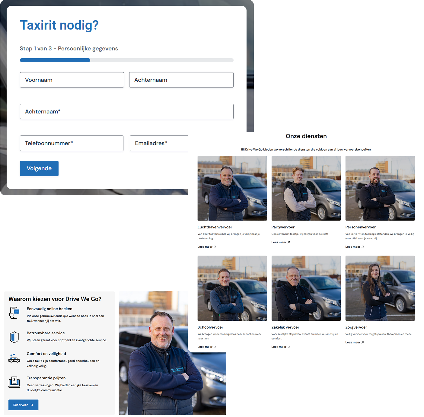 Er is gekozen voor een fris en modern ontwerp dat perfect aansluit bij de uitstraling van Drive We Go, inclusief nieuwe iconen, passende kleuraccenten en professioneel beeldmateriaal.
