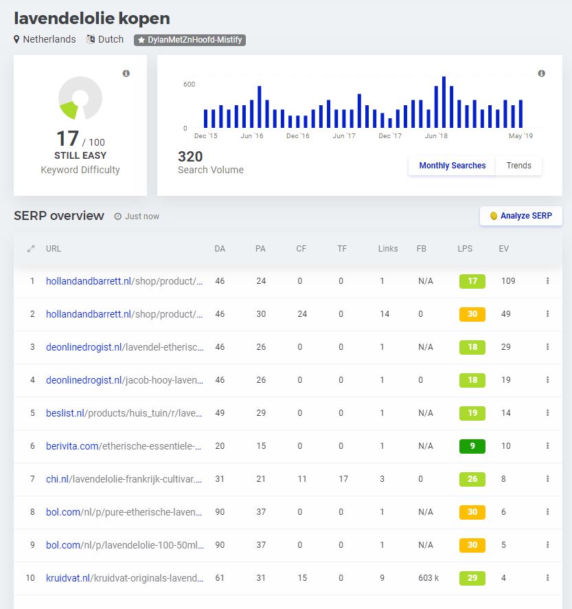 Ook zien we wat de huidige top 10 websites zijn die voor dat zoekwoord ranken. Zo kunnen we de juiste koers uitzetten en bepalen op welke keywords we ons willen gaan richten.
